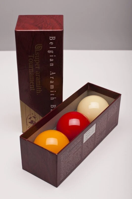 Die Turnier-Kugeln aus Super Aramith. In moderner FĂ€rbung mit einer weiĂen, einer gelben und einer roten Kugel. Die Kugeln haben den fĂŒr Turniere vorgeschriebenen Durchmesser von 61,5mm.