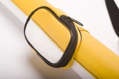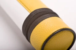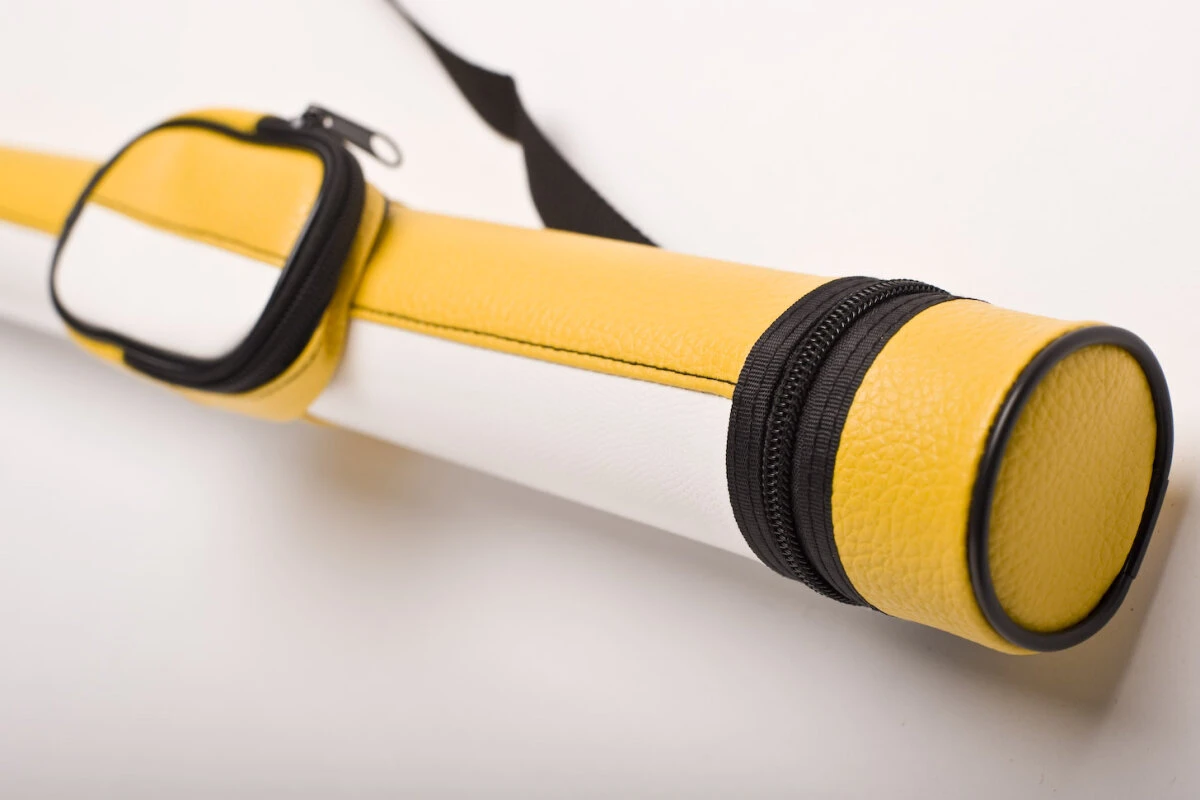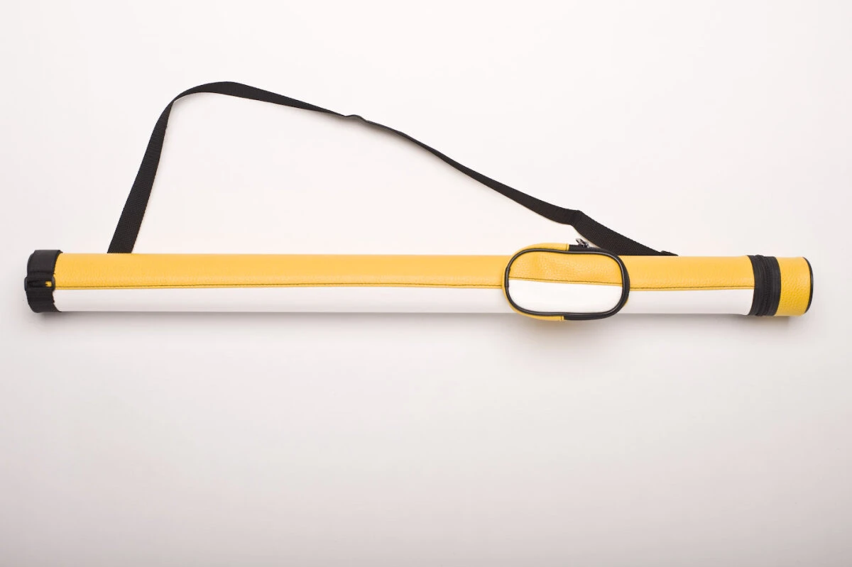 Hervorragend verarbeiteter Köcher für ein Billardqueue (jeweils ein Unter- und ein Oberteil), Schultergurt, sportliches Design in weiß-gelbem Kunstleder, Reißverschluss, Seitentasche für Billardzubehör