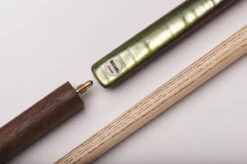 Ein schönes Queue in außergewöhnlichem Design mit 9,5mm breitem Klebeleder. Teil des selbstverständlich echt gespliceten Dekors ist eine Einlage aus grün leuchtendem Kunststoff im Unterteil, den Sie so nur selten zu sehen bekommen werden. Zusammen mit der Verwendung verschiedener Hölzer entsteht ein ganz besonderes Design für ein Snookerqueue. Das Queue ist 3/4-geteilt und benötigt somit einen entsprechenden Snooker-Koffer. Zusätzlich erhalten Sie eine 15 cm lange Verlängerung, die Sie in das Gewinde am Ende des Queues einschrauben können.