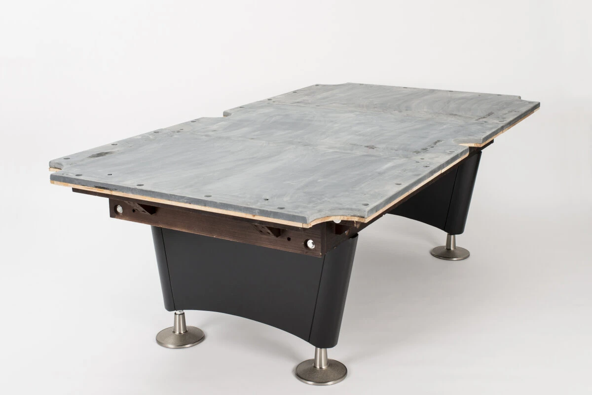 Die Unterkonstruktion aus massiven Holzträgern hat sich seit Jahren bei Turniertischen international als bewährter Standard etabliert. Zur Feinjustierung der drei Präzisions-Schieferplatten mit einer Stärke von 2,5 cm kommt bei diesem Modell insgesamt 22 Stellschrauben zum Einsatz. Dieses System ist dem herkömmlichen System des Ausrichtens der Platten mit Holzkeilen deutlich überlegen, was Präzision und Handlichkeit angeht. Gerade deshalb ist dieses Model auch bei den Monteuren der absolute „Liebling“. Ein weiterer Vorteil dieses Systems: auch im endmontierten Zustand lassen sich die Platten jederzeit nachjustieren.