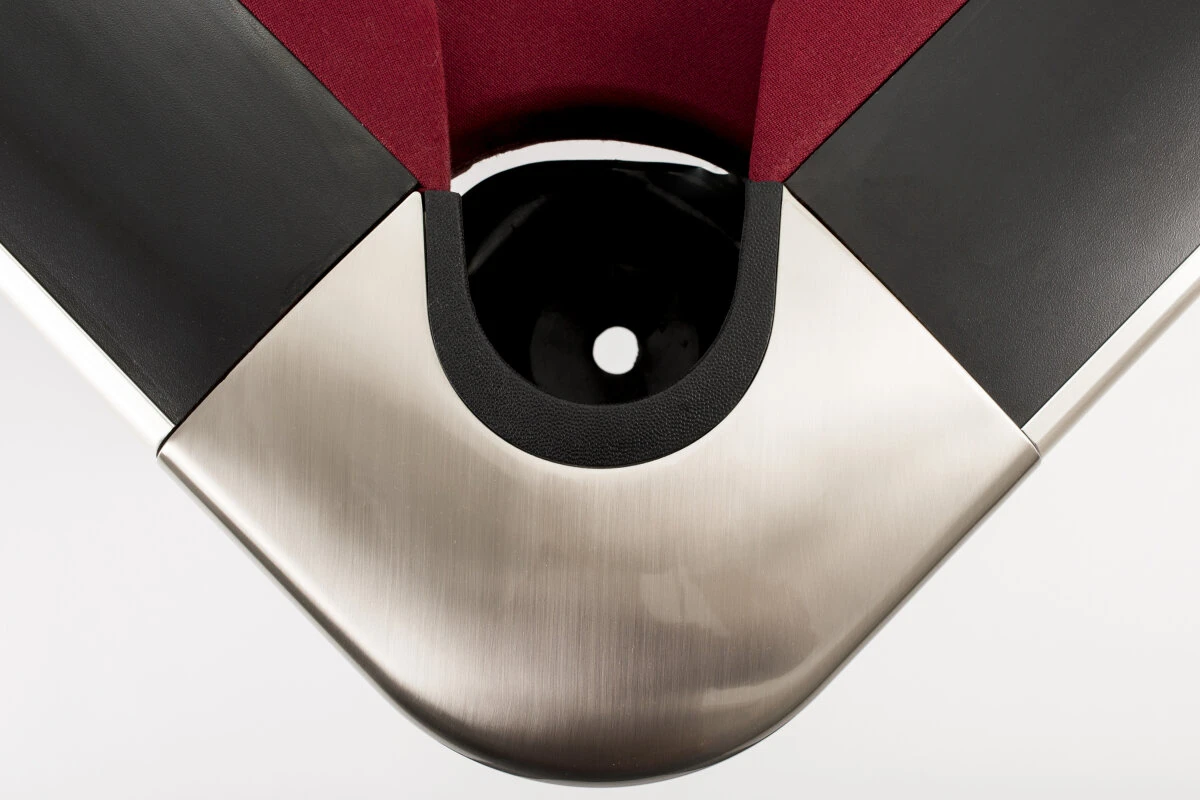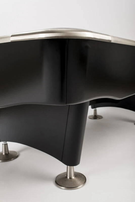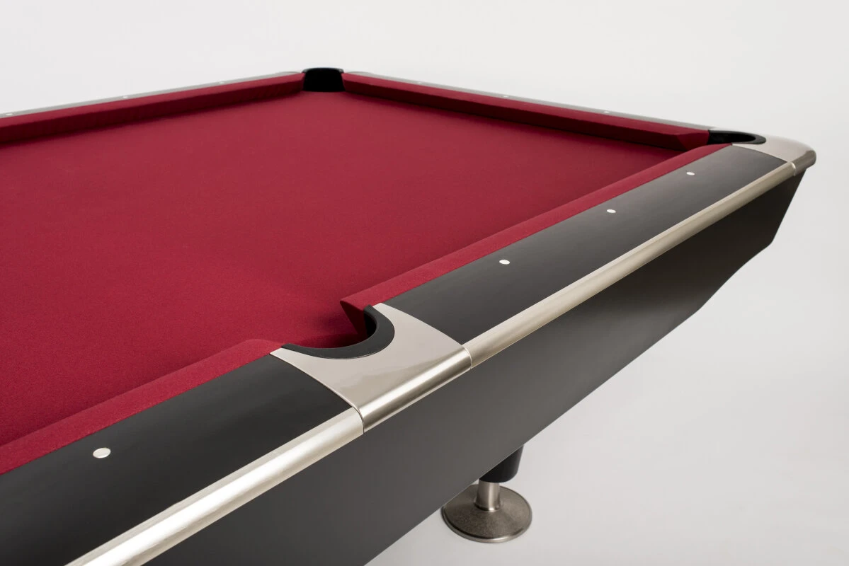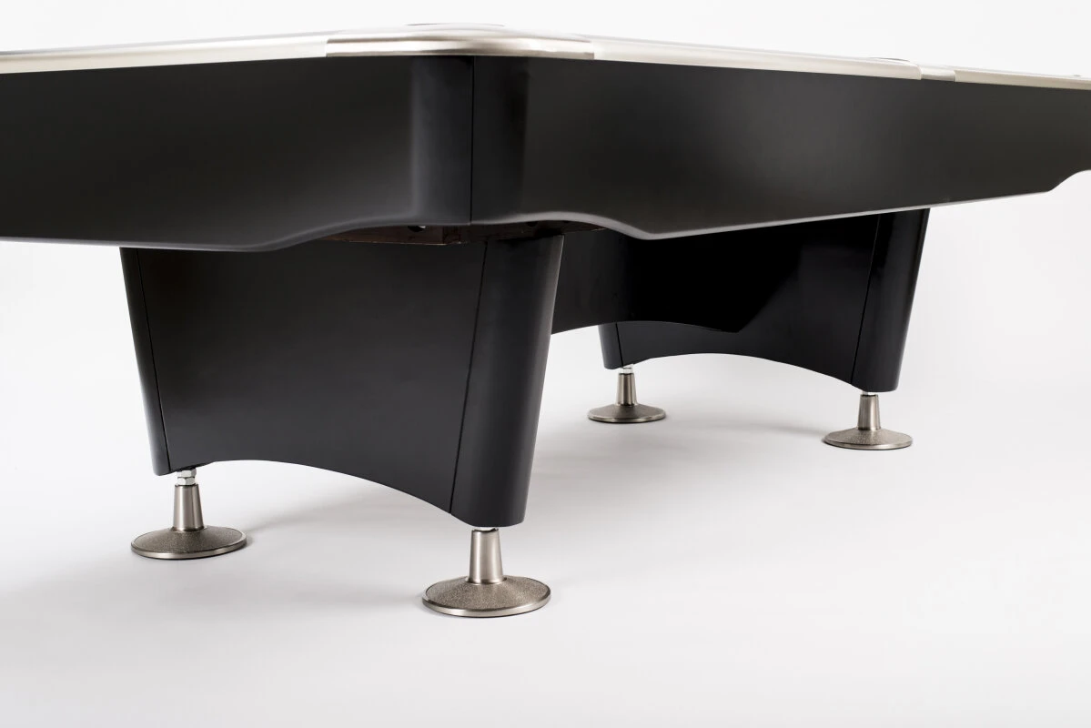 Der Bandenrahmen dieses Billardtisches besteht aus massivem nordamerikanischen Hartholz und ist mit einer besonders schlag- und kratzfesten Beschichtung aus HPL (wird auch für Küchenarbeitsplatten verwendet) versehen. Auch die Seitenblenden, die Füße sowie der Querträger sind aus massivem Holz gefertigt und bestechen durch ihre edle matt-schwarze Oberfläche.