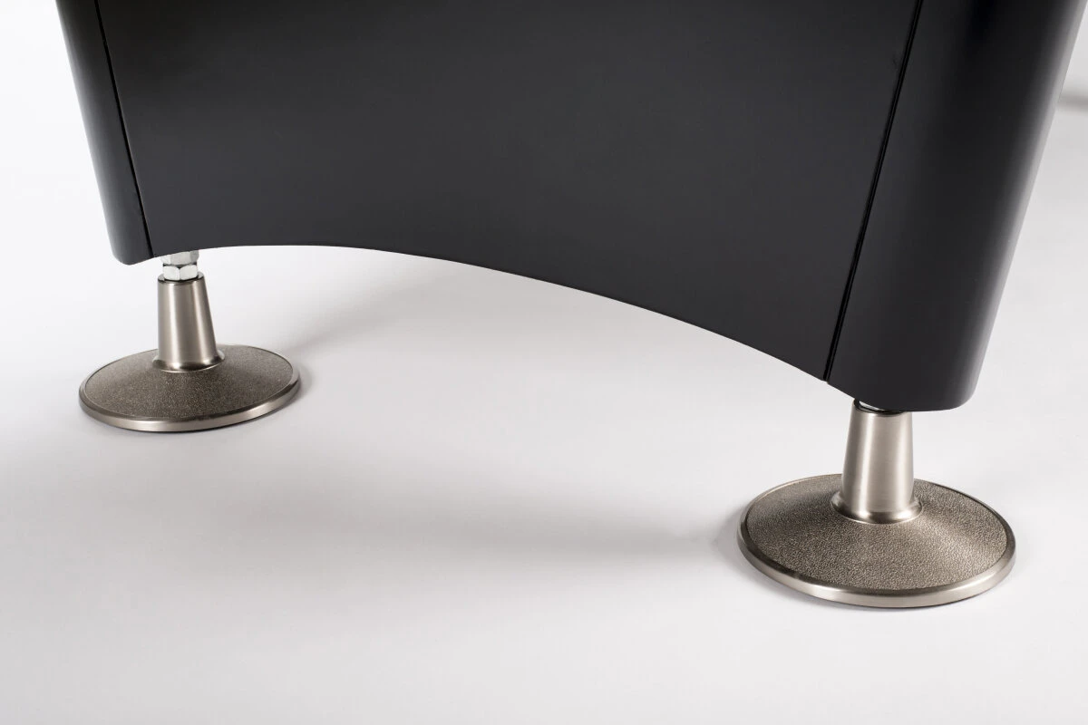Die vier massiven Stahltellerfüße sind die Grundvoraussetzung für den stabilen Stand des Untergestells. Sie sind höhenverstellbar und dienen damit zunächst einmal der Grundausrichtung des Tisches. Eine Gummibeschichtung auf der Unterseite verhindert das Verrutschen auf glattem Untergrund und schützt somit Ihren hochwertigen Bodenbelag.
