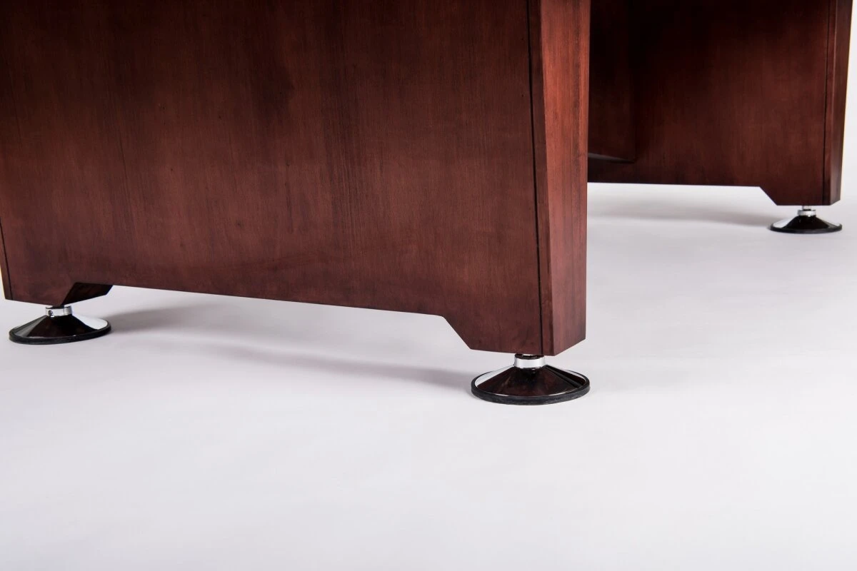 Die vier massiven Stahltellerfüße sind die Grundvoraussetzung für den stabilen Stand des Untergestells. Sie sind höhenverstellbar und dienen damit zunächst einmal der Grundausrichtung des Tisches. Eine Gummibeschichtung auf der Unterseite verhindert das Verrutschen auf glattem Untergrund und schützt somit Ihren hochwertigen Bodenbelag.