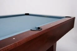 Der Bandenrahmen dieses Billardtisches ist mit einer besonders schlag- und kratzfesten Beschichtung aus HPL (wird auch für Küchenarbeitsplatten verwendet) versehen. Auch die Seitenblenden, die Füße sowie der Querträger sind aus massivem Holz gefertigt und bestechen durch das edle braune Design. Anders als bei optisch ähnlichen Modellen sind die Kappen an den Ecktaschen aus Metall und nicht aus Kunststoff gefertigt. Am Cuel Sport werden Sie lange Freude haben.
