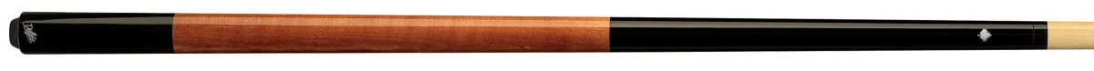 Einfaches, nachtschwarzes Queue mit silbernem Ahornblatt-Logo und edlem lackierten kirschholz-gebeiztem Griffbereich.
