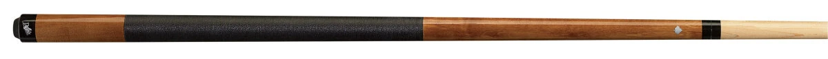 Einfaches, kirschholz-farben gebeiztes Queue mit silbernem Ahornblatt-Logo und schwarzem Griffband aus irischem Leinen.
