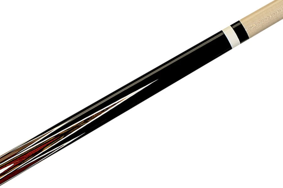 Pool-Queue aus geringeltem Ahorn in mystischem schwarz mit Einlagen aus Cocobolo und Bocote umrandet von Elfenbein-Imitat und verziert mit Diamant-Elementen aus Elfenbein-Imitat. Mit Zierringen im Silber/Bocote/Silber-Look und größeren Cocobolo-Ringen, solidem schwarzem Griffband aus irischem Leinen, Implex-Joint und Uni Loc Schnellverschluss.