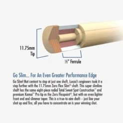 Die Lucasi-Ingenieure gehen noch einen Schritt weiter mit dem 11,75mm Zero Flex Slim-Oberteil. Dieses super schlanke Oberteil hat die gleiche achtteilige Total Sweet Spot Construction und ein Premium Kamui Pro 10-Schicht-Leder wie das Zero FLEXPOINT, aber mit einem noch geringeren Gewicht am vorderen Ende, einem kürzeren (7/8 „) Kern und schlankerem Taper (Schliff). Was bedeutet das für Ihr Spiel? Noch mehr Genauigkeit und geringere Abweichung und mehr Wirkung.