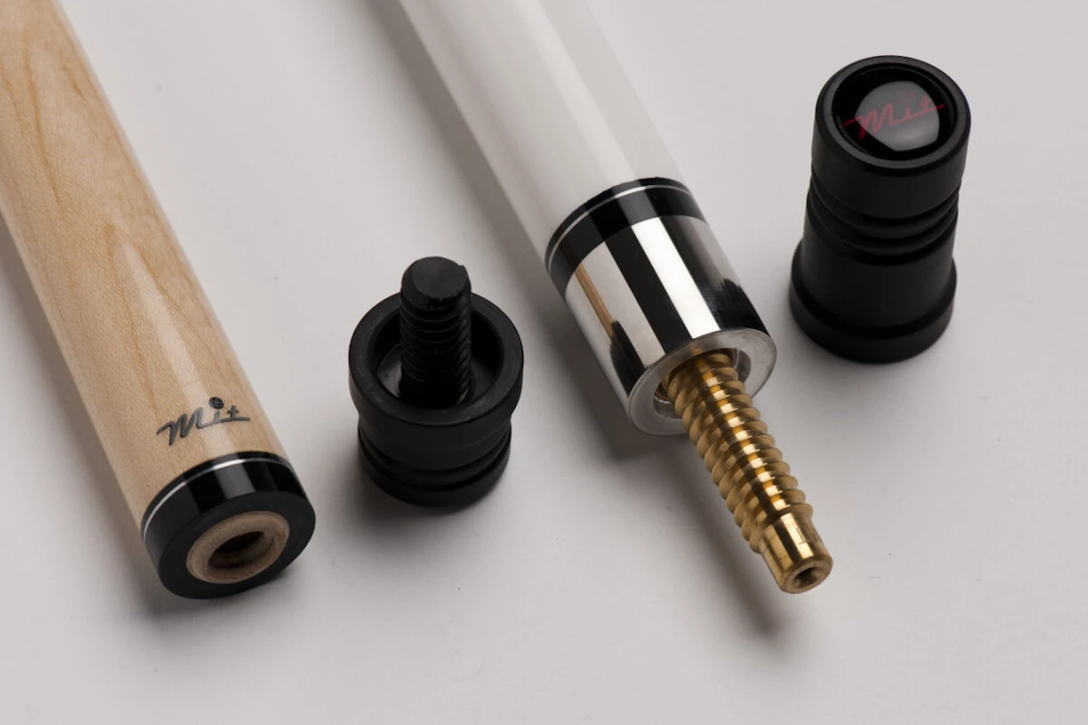 Die MF2-Serie von MIT kommt im im einfarbigen schlichten Look daher. Alle Queues verfĂĽgen ĂĽber ein Vollholz-Oberteil und sind in der Mitte im Verhältnis 1:1 geteilt. Ein 3/8×11-Gewinde sorgt fĂĽr eine optimale Verbindung und gute WirkungsĂĽbertragung. Alle Billard-Queues sind mit einem Qualitäts-Schichtleder bestĂĽckt und verfĂĽgen ĂĽber ein gewickeltes Griffband aus irischem Leinen.