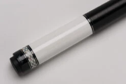 Wer sich ein einfaches, aber edles Queue wünscht, fährt mit den beiden Queues dieser Serie richtig. Das MF2-002 kommt in komplett weißer Lackierung daher und hat ein schwarzes Griffband aus irischem Leinen. Am Butt hat das Queue einen schönen eingelegten Zierring in Karo-Muster. Kleine Zierringe ebenfalls am Griffband und am Gewinde. Wir haben hier eine zuverlässige 3/8-11-Verschraubung aus Messing mit Holzgewinde für beste Kraftübertragung beim Stoß. Bei diesem Modell wurde eine Kunststoff-Ferrule verarbeitet und mit einem Qualitäts-Schichtleder versehen. Lieferung inkl. Gewindeschoner zum Schutz Ihres Queues.