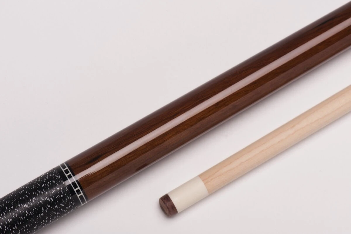 Das MW2-003 hat eine helle Färbung, die von der dunklen Maserung durchzogen wird. Das Griffband besteht aus komplett schwarzem irischen Leinen. Wir haben hier eine zuverlässige 3/8-11-Verschraubung aus Messing mit Holzgewinde für beste Kraftübertragung beim Stoß. Bei diesem Modell wurde eine Kunststoff-Ferrule verarbeitet und mit einem Qualitäts-Schichtleder versehen. Rostfreies Metall am Ende des Queues macht den besonderen Eindruck komplett. Lieferung inkl. Gewindeschoner zum Schutz Ihres Queues.