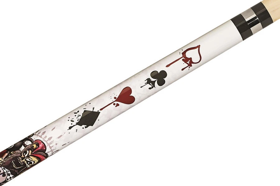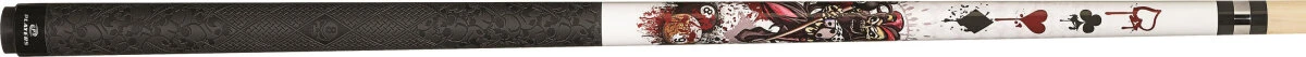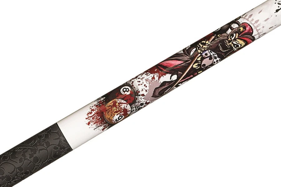 Dieses Pool-Queue mit weiĂźem Forearm ziert ein cooles Motiv mit einem fiesen billardspielenden Joker im hinteren Teil und einem Spielkarten-Design. Das gummierte schwarze Griffband mit Multi-Zone-Traktion ist mit einem Totenkopf-Muster versehen.