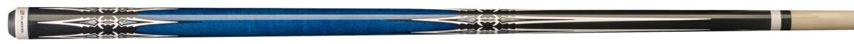 Klassisches Queue aus kobaltblau gebeiztem Vogelaugen-Ahorn mit perlmuttverziertem Dolchmotiv vorne und hinten und schwarz-weißem Gewindekragen. 5/16×18-Gewinde mit Implex-Joint, ohne Griffband.