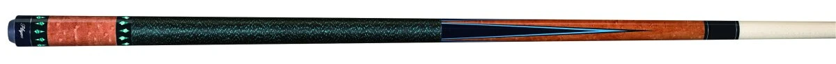 Antik gebeiztes Queue aus Vogelaugen-Ahorn mit nachtschwarzen und türkisen Akzenten. Versehen mit einem Griffband aus doppelt gepresstem irischen Leinen in schwarz/türkis und dem neuen HXT-Low-Deflection-Oberteil.