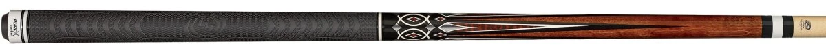 Klassisch gestaltetes Queue mit schokoladen-farbenem Forearm, schwarz-weißen Flammen, grauen Akzent-Diamanten, Silberringen und sportivem Griffband aus ergonomischem Gummi für perfekten Grip. Natürlich mit dem neuen HXT-Low-Deflection-Oberteil.