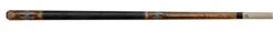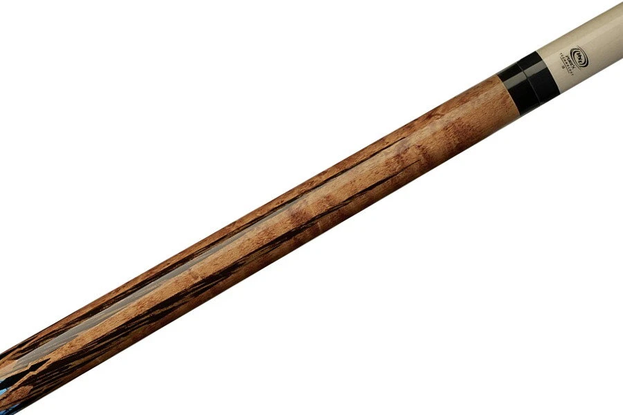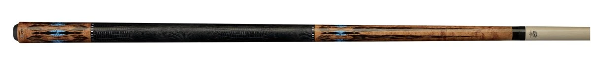 Golden gebeiztes Queue im antiken Look aus Vogelaugen-Ahorn mit verzierenden Designs in hellblau. Versehen mit einem schwarzen Leder-Griffband mit Echsen-Prägung und dem neuen HXT-Low-Deflection-Oberteil.
