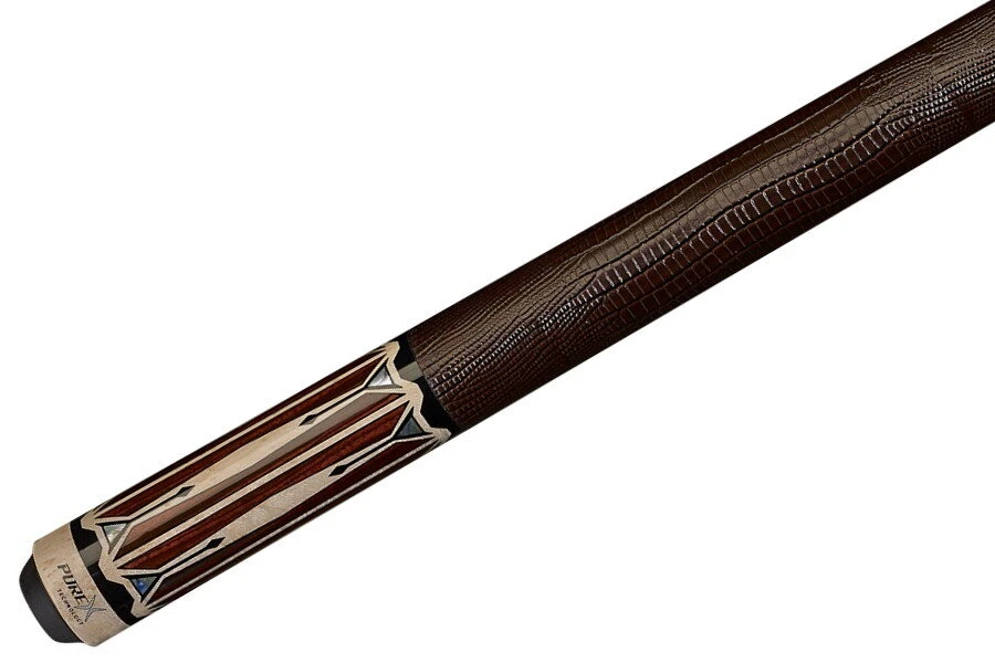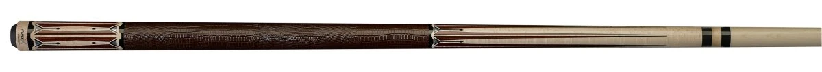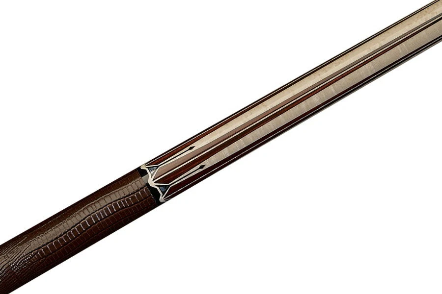Queue im natürlichen Look aus Vogelaugen-Ahorn mit verzierenden Designs. Versehen mit einem braunen Leder-Griffband mit Echsen-Prägung und dem neuen HXT-Low-Deflection-Oberteil.