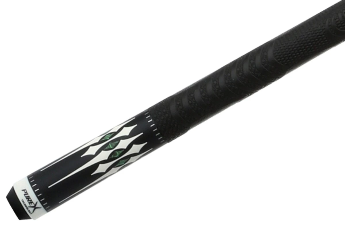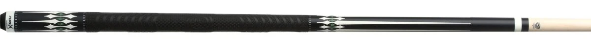 Klassisch gestaltetes Queue aus nordamerikanischem Ahorn mit Designelementen in Mitternachtsschwarz, WeiĂź und Malachit-GrĂĽn, mit Kamui-Leder, sportivem Griffband aus ergonomischem Gummi fĂĽr perfekten Grip und HXT-Low-Deflection-Oberteil.