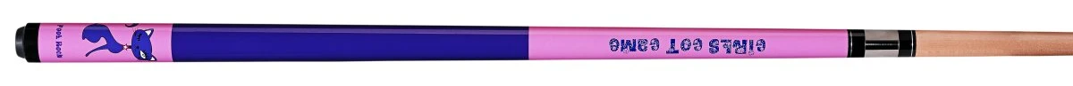 Die Queues dieser Reihe sind für Kinder optimiert – sie sind etwas kürzer und leichter und haben schicke Designs für Jungs und Mädchen. Dieses Queue aus nordamerikanischem Ahorn hat ein schickes pinkes Design mit lila Kätzchen und dem Spruch „Girls got game“.