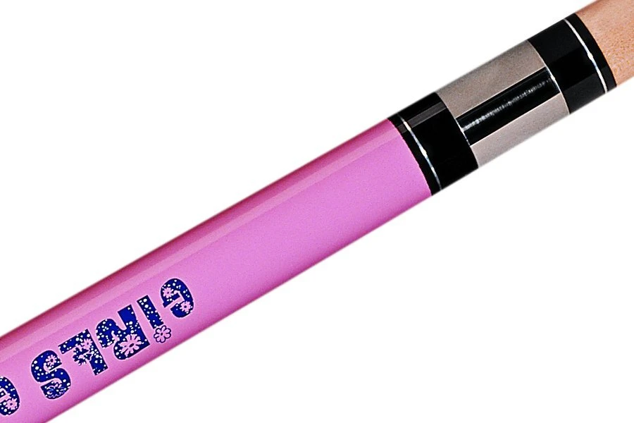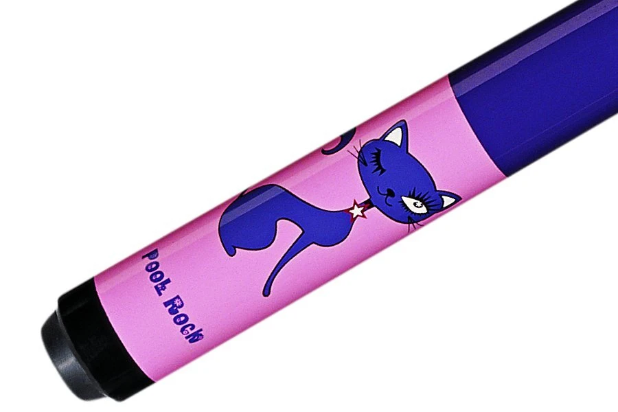 Die Queues dieser Reihe sind für Kinder optimiert – sie sind etwas kürzer und leichter und haben schicke Designs für Jungs und Mädchen. Dieses Queue aus nordamerikanischem Ahorn hat ein schickes pinkes Design mit lila Kätzchen und dem Spruch „Girls got game“.