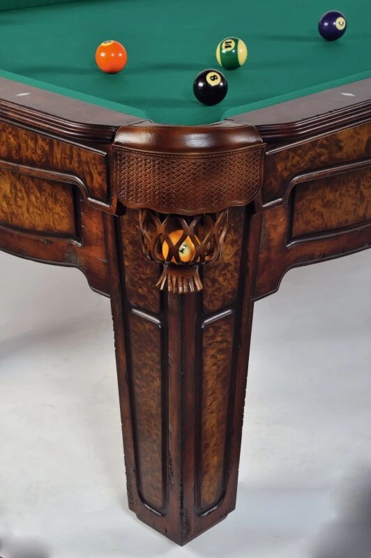 Ein Blickfang sind auch die wunderschönen handgearbeiteten Echtledertaschen im passenden Antikbraun. Doch nicht nur optisch ist der „Wellington“ unschlagbar! Sein verzugsfreier Massivholzunterbau sowie die 3-teilige, 25 mm starke Naturschieferplatte garantieren 100% Stabilität. Ein zusätzlicher Vorteil sind die dezenten Stellfüße unter den mit dekorativen Ornamenten versehenen Holzbeinen. Es versteht sich von selbst, dass die Bandengummi aus bester und langlebiger Turnierqualität besteht.