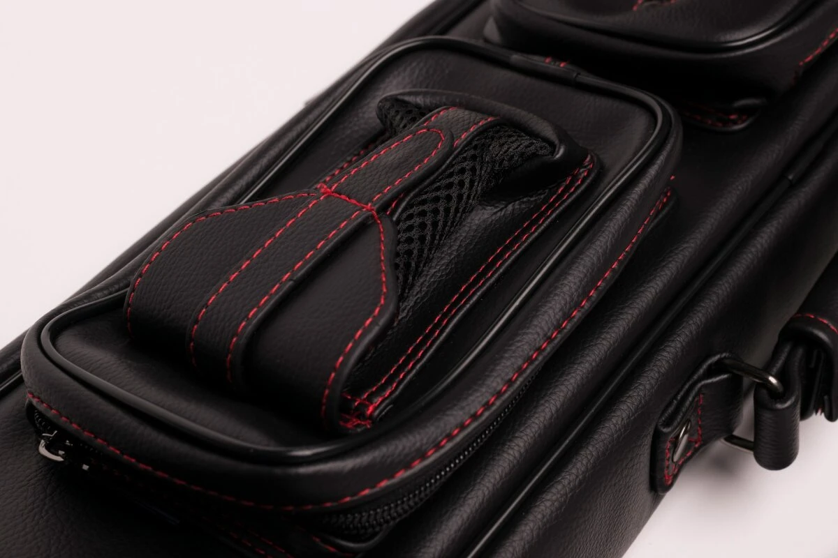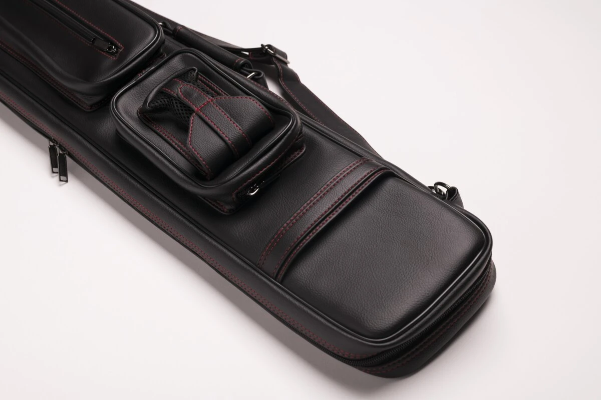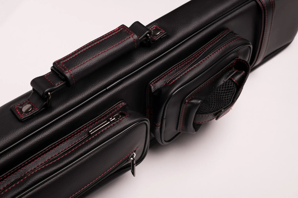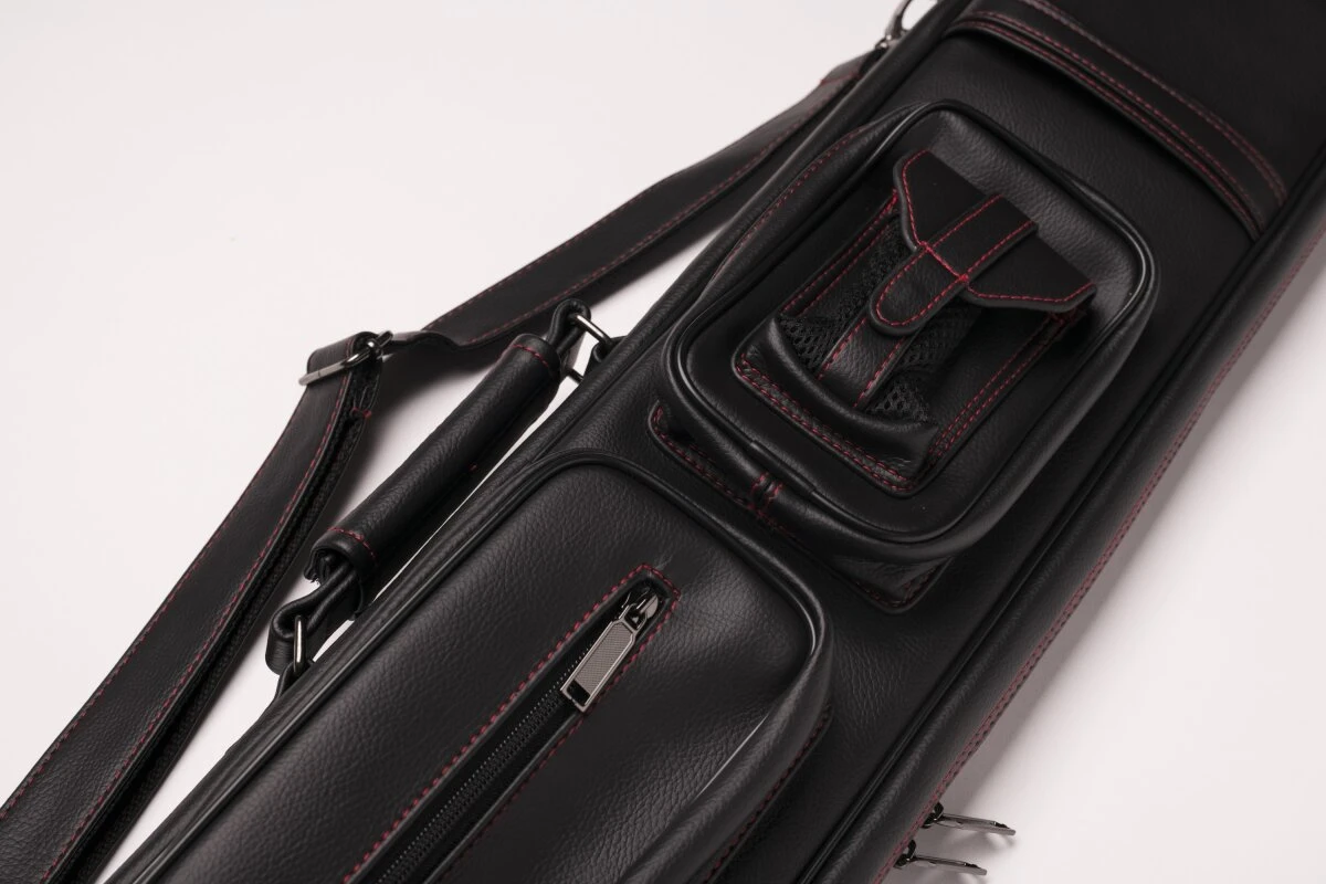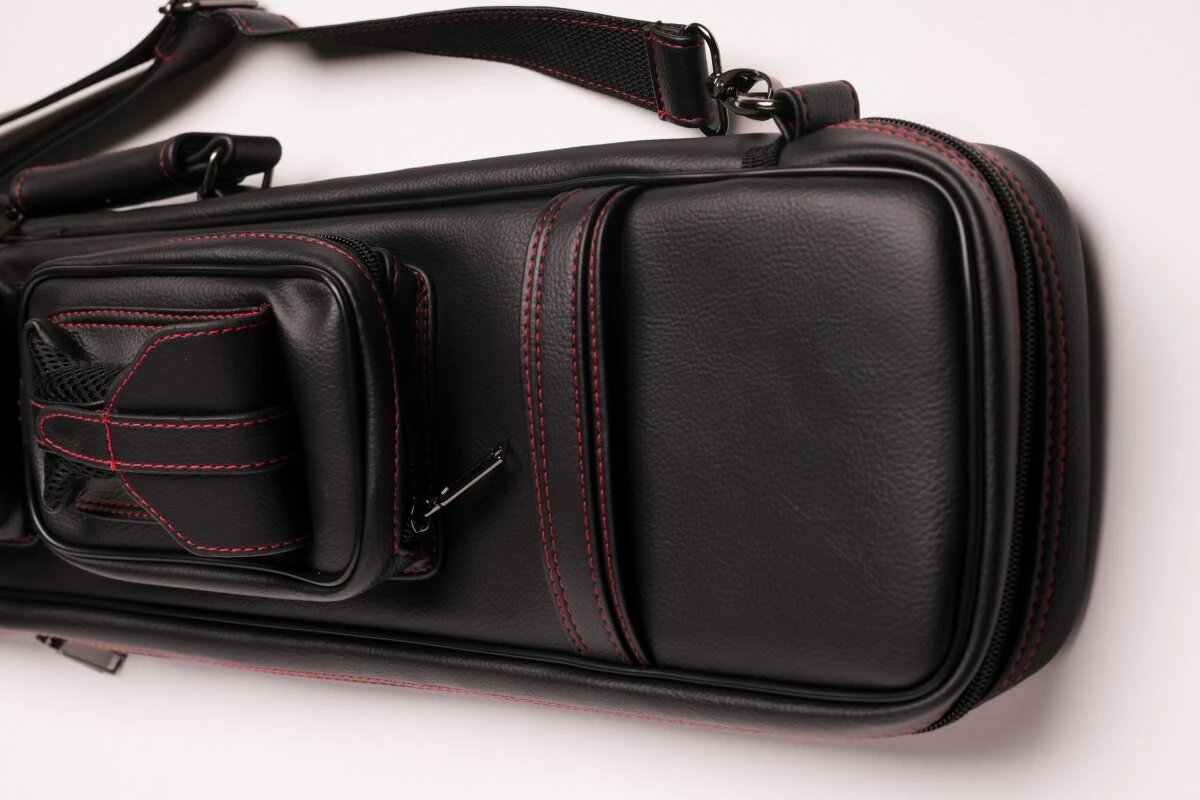 Schicke und zeitlose Queuetasche aus weichem Kunstleder. Für 2 Unter- und 4 Oberteile, dank der flexiblen Schuberaufteilung aber auch anders kombinierbar. In die Seitentaschen passt etliches Zubehör, in die längere Seitentasche auch das Unterteil eines Jump-Queues. Queuetaschen haben den Vorteil, dass sie deutlich leichter sind als Köcher, was der eine oder andere bevorzugt. Mit verstellbarem Schultergurt und zwei Tragegriffen.